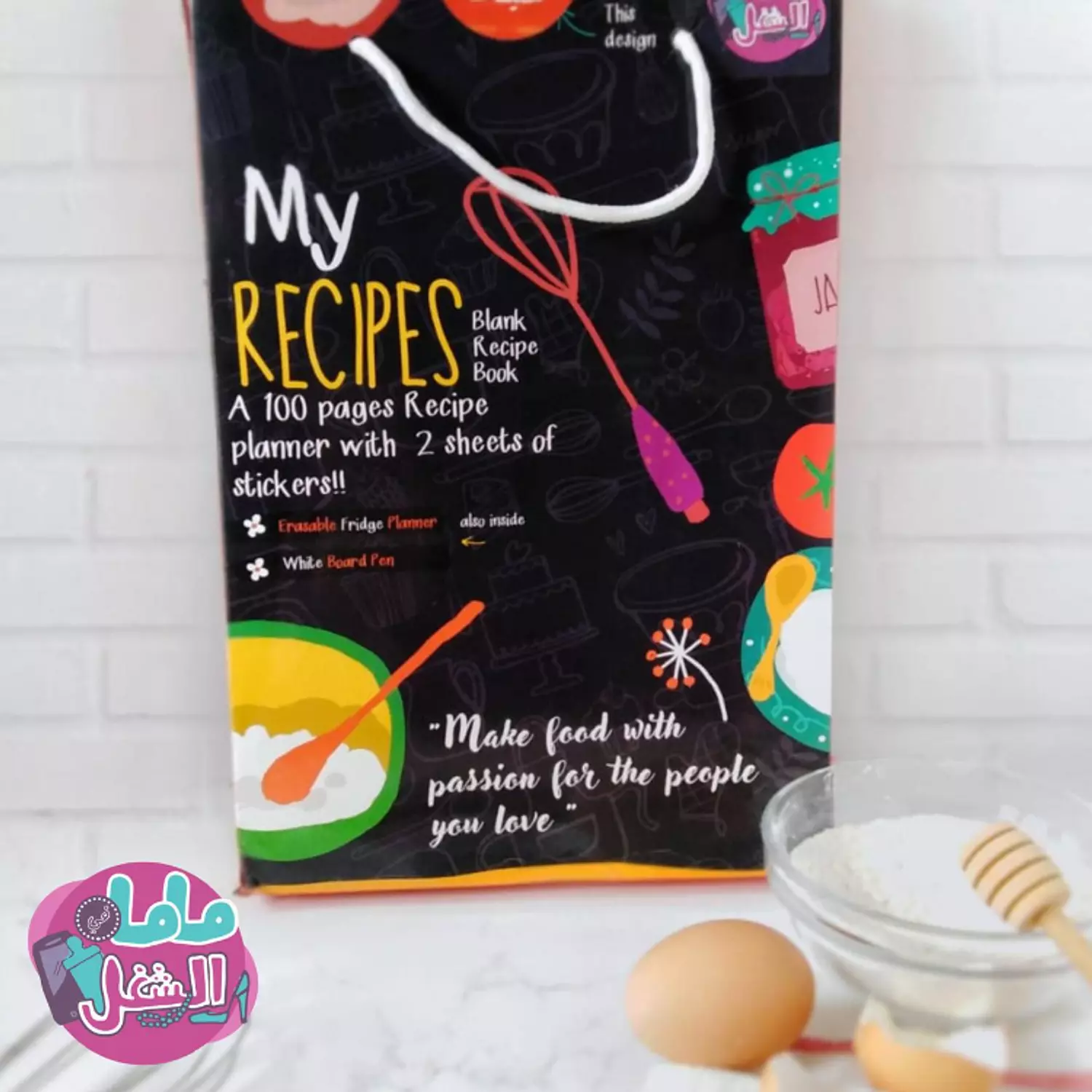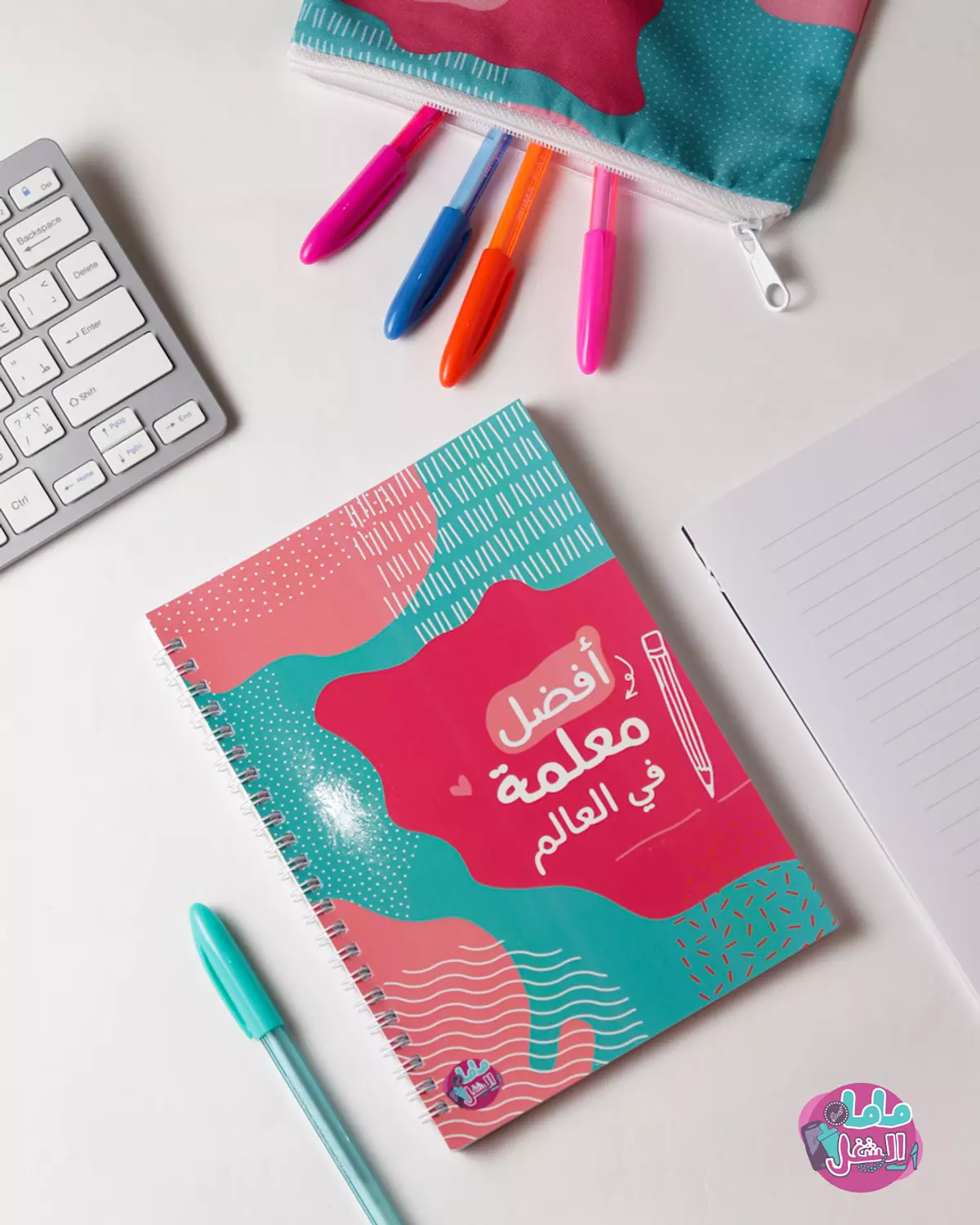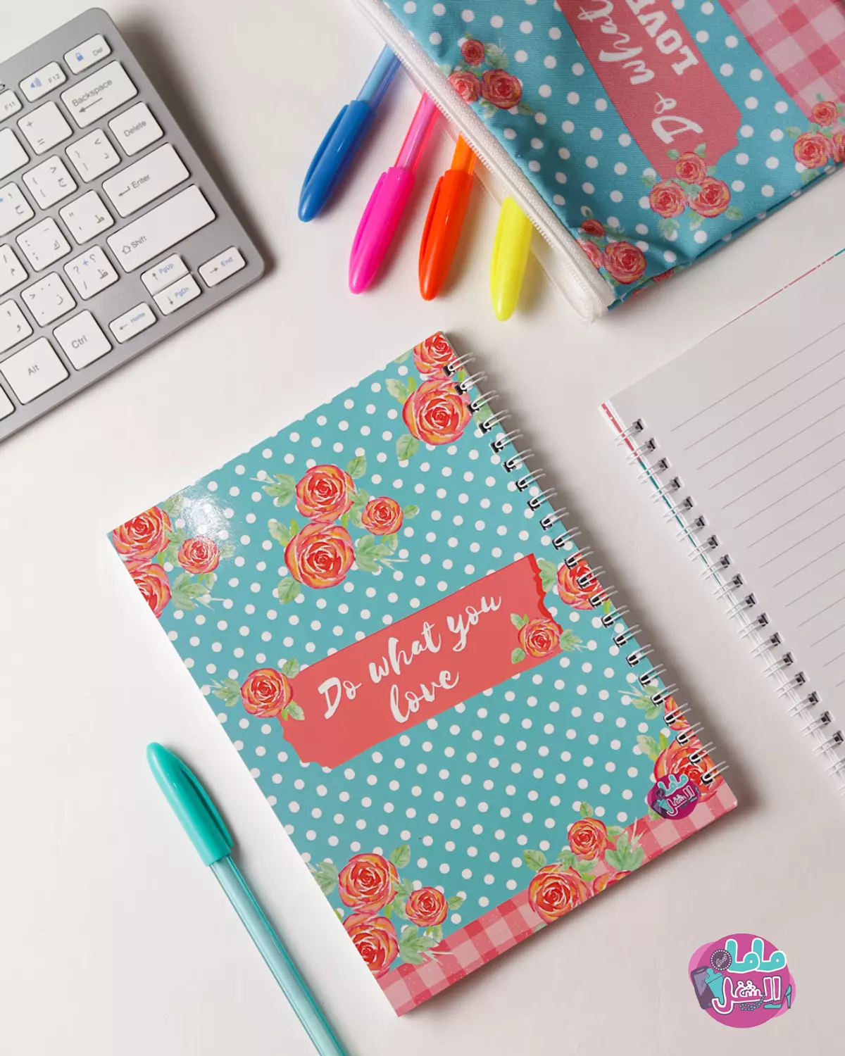 - The notebook has the name written in English on the left cover and in Arabic on the right cover