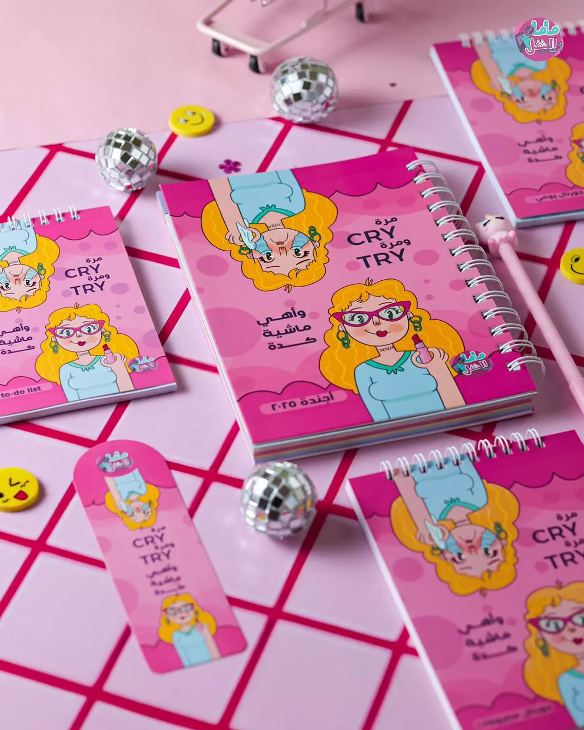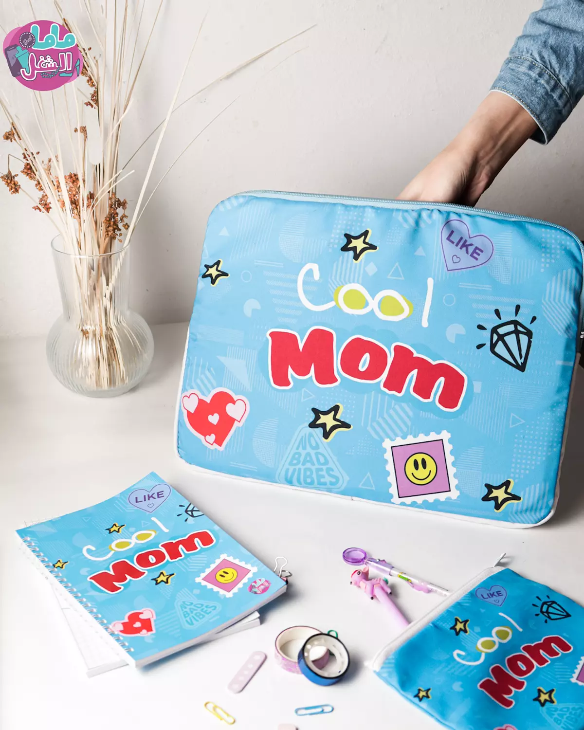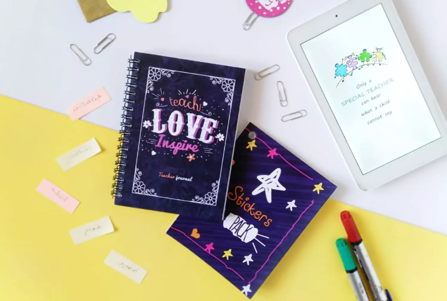 - The notebook has the name written in English on the left cover and in Arabic on the right cover